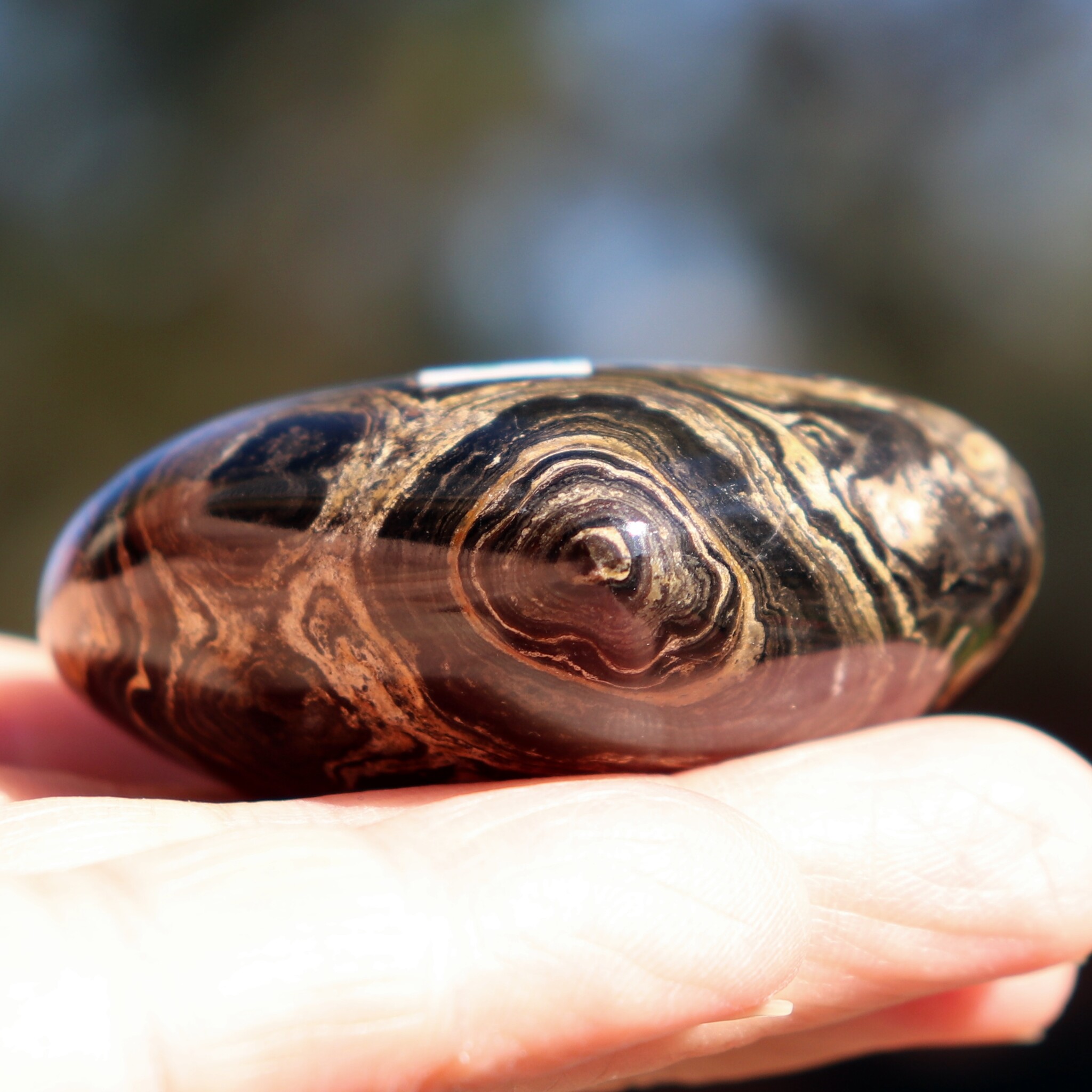 ストロマトライトは、微生物である藍藻類の死骸と、泥粒などから形成される岩石です。黒と金色がかった明るい茶色が、蒔絵を思わせるようで大変美しいです(画像では茶色が黄色に見えるかもしれませんが、実際には暖かみのある金茶です)。