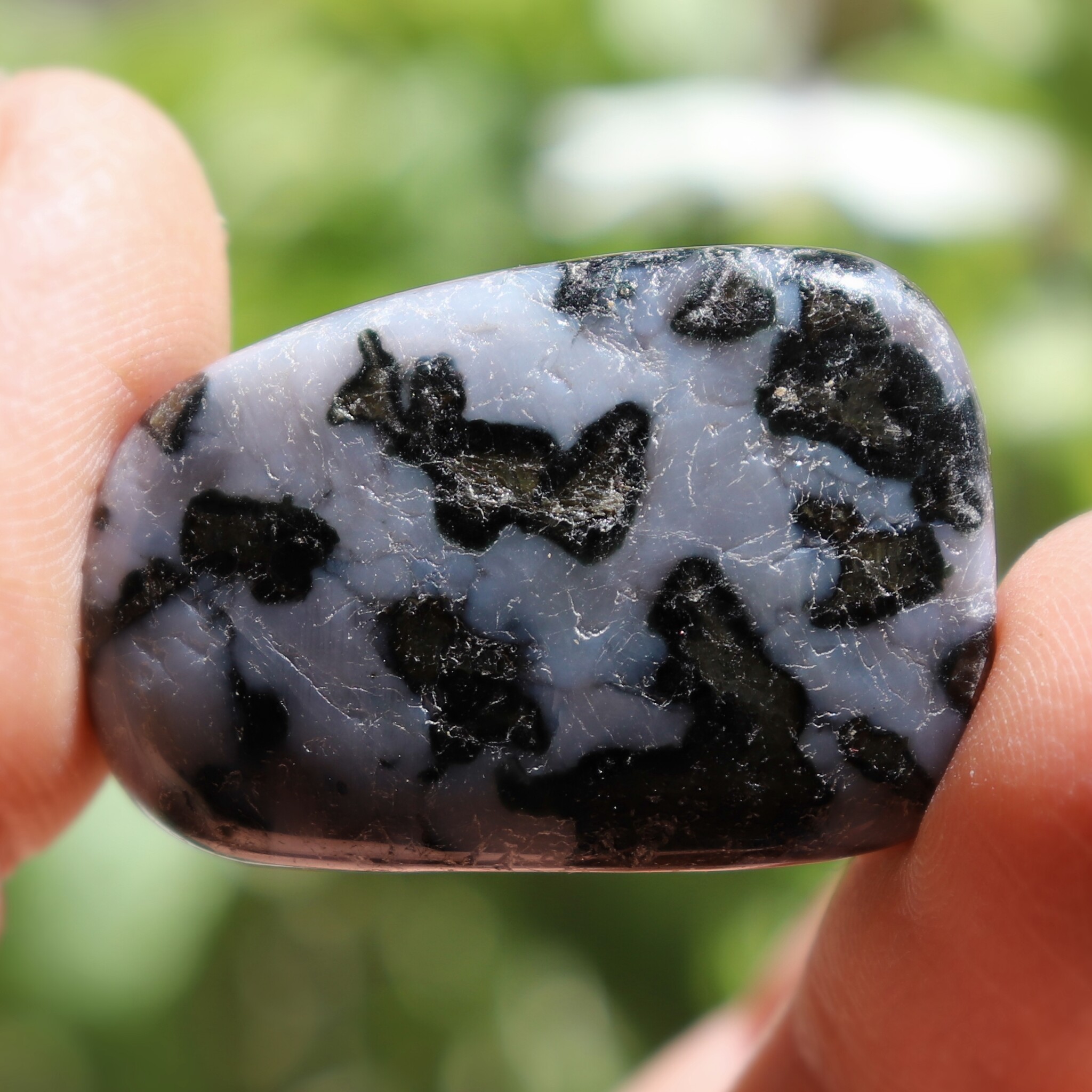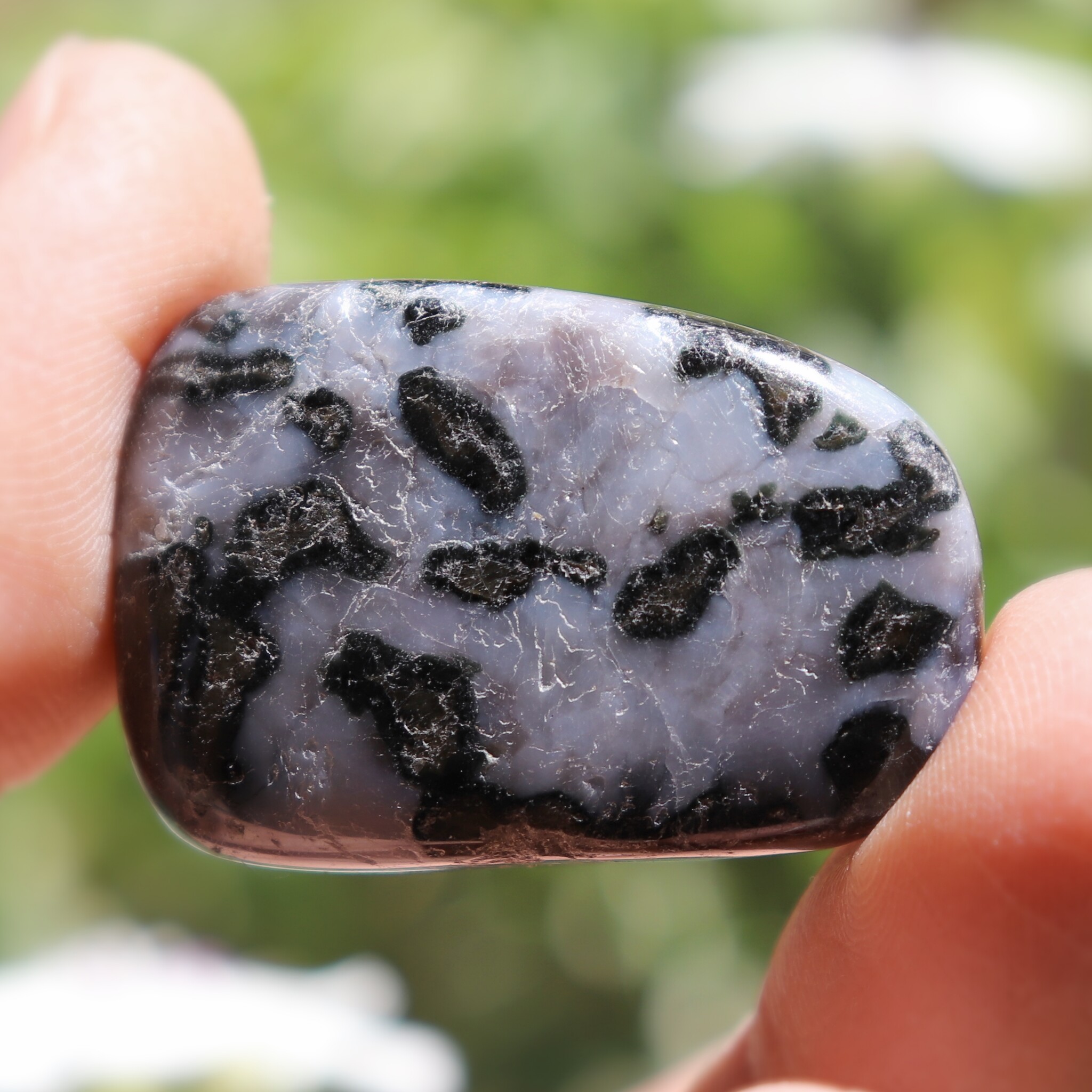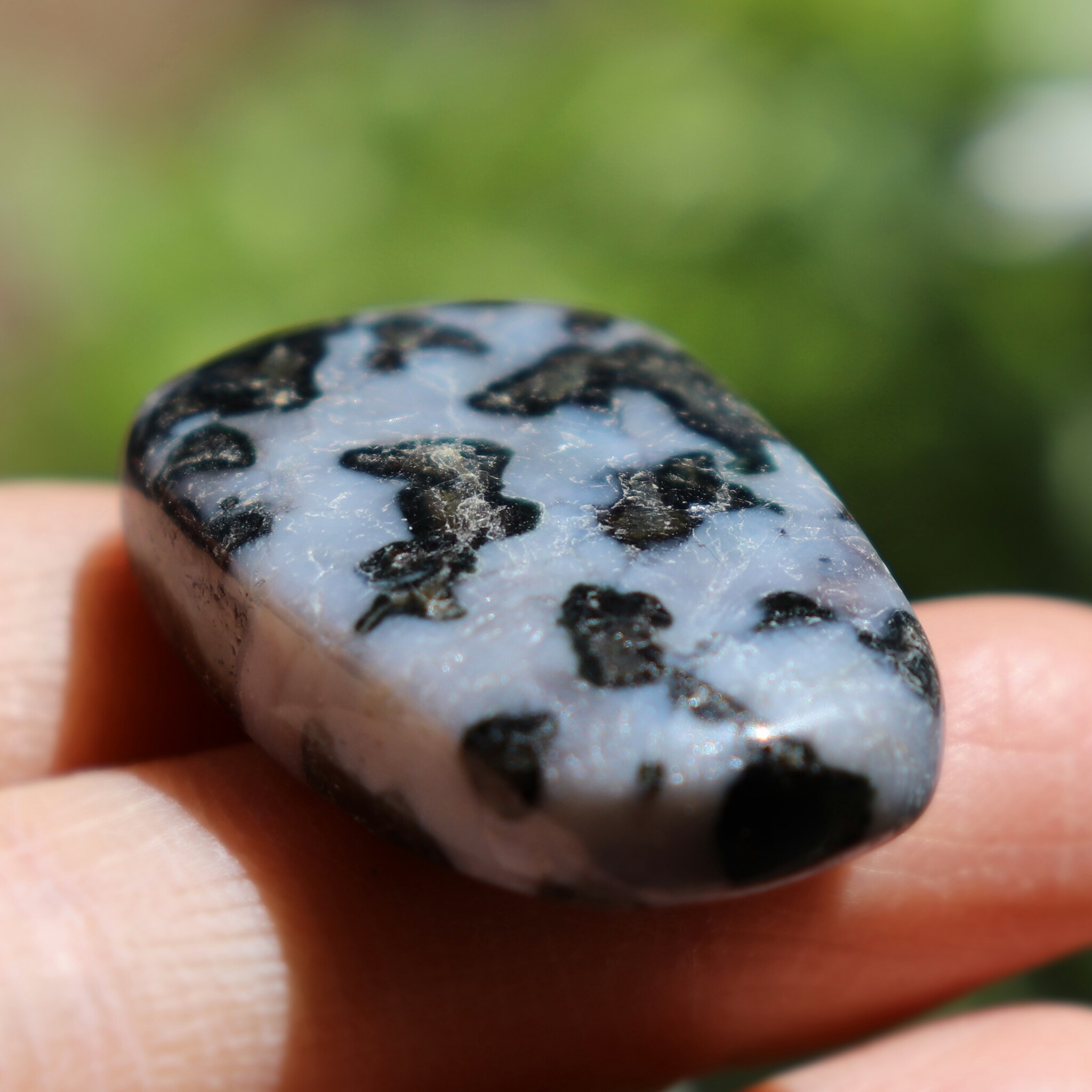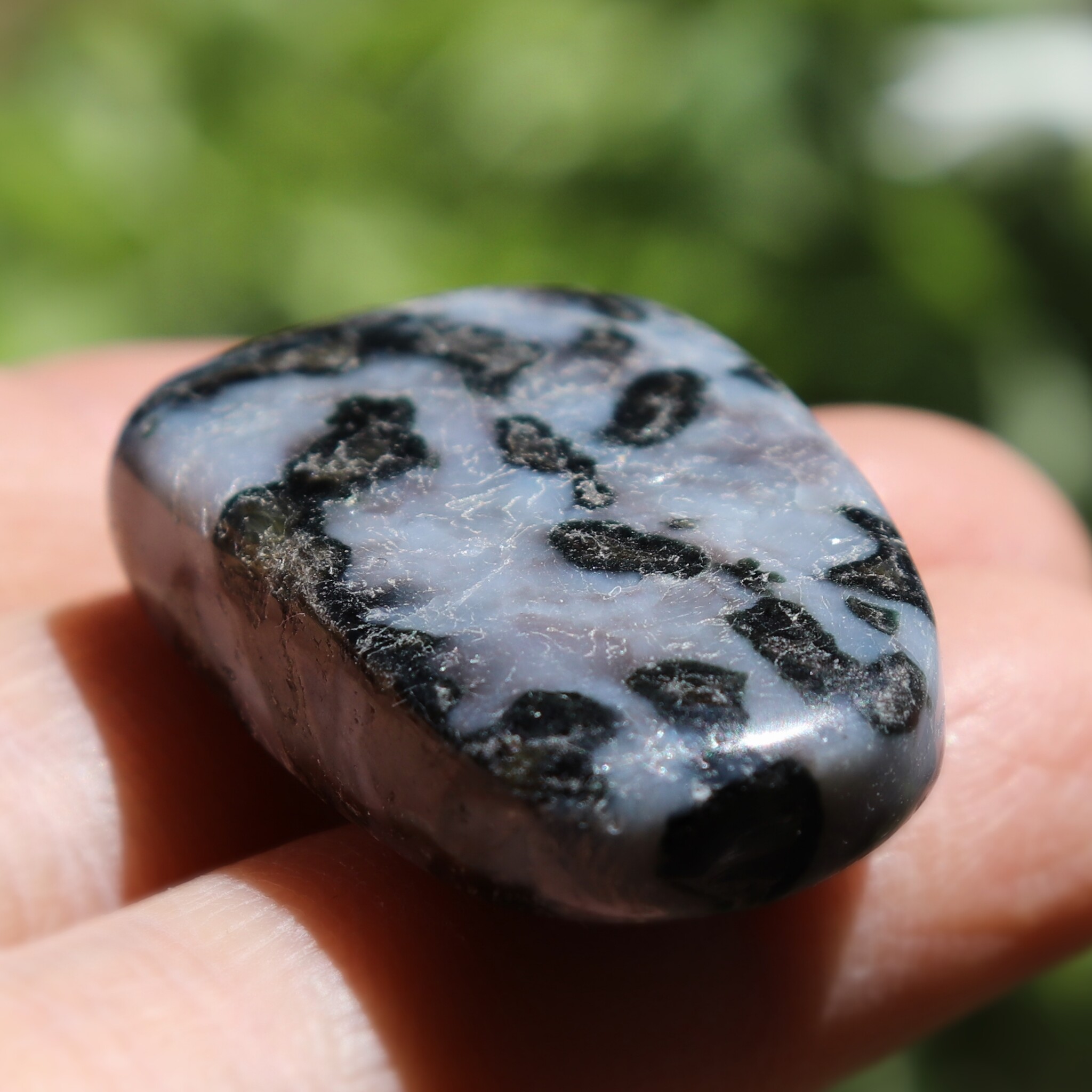 ミスティック・マーリナイトは、インド洋の孤島で発見された石で、長石、クォーツ、微量元素が含まれているそうです。推測ですが、アーサー王伝説に出てくる魔法使いマーリン(Merline)にちなんでつけた名前ではないかと思います。ミスティックというのは「神秘的な」という意味ですから、さしずめ、「神秘のマーリン石」というところでしょうか。青みがかった灰色の地にヒョウ柄(?)という何とも面白い石です。