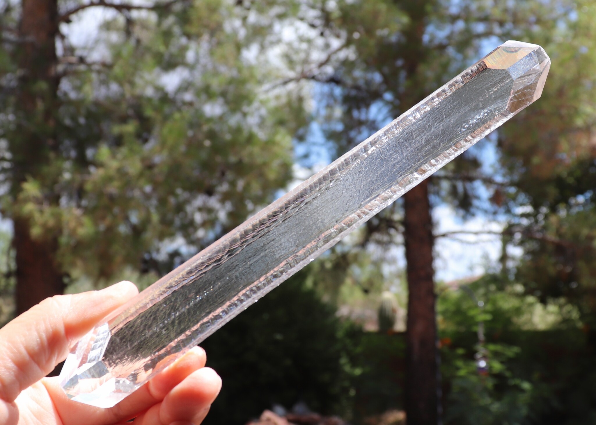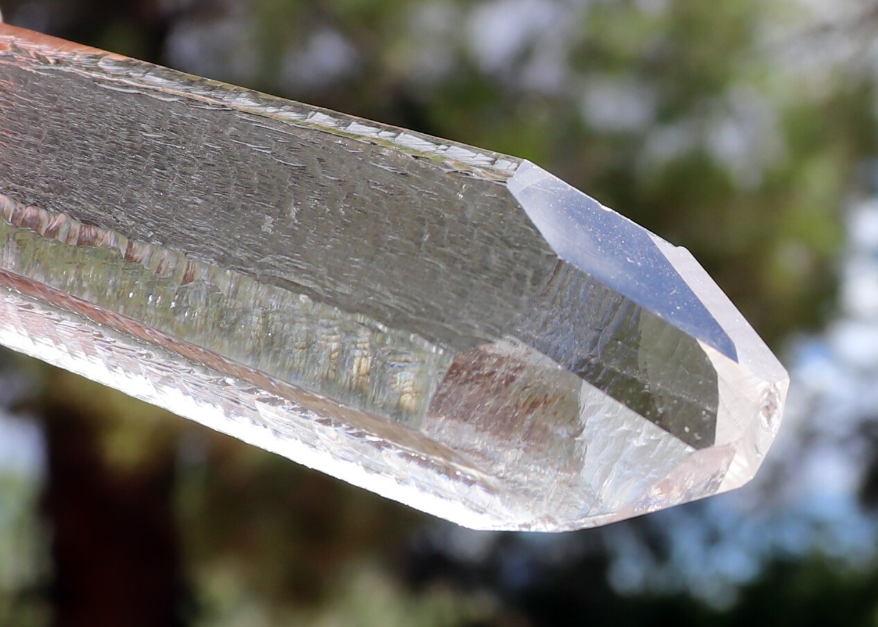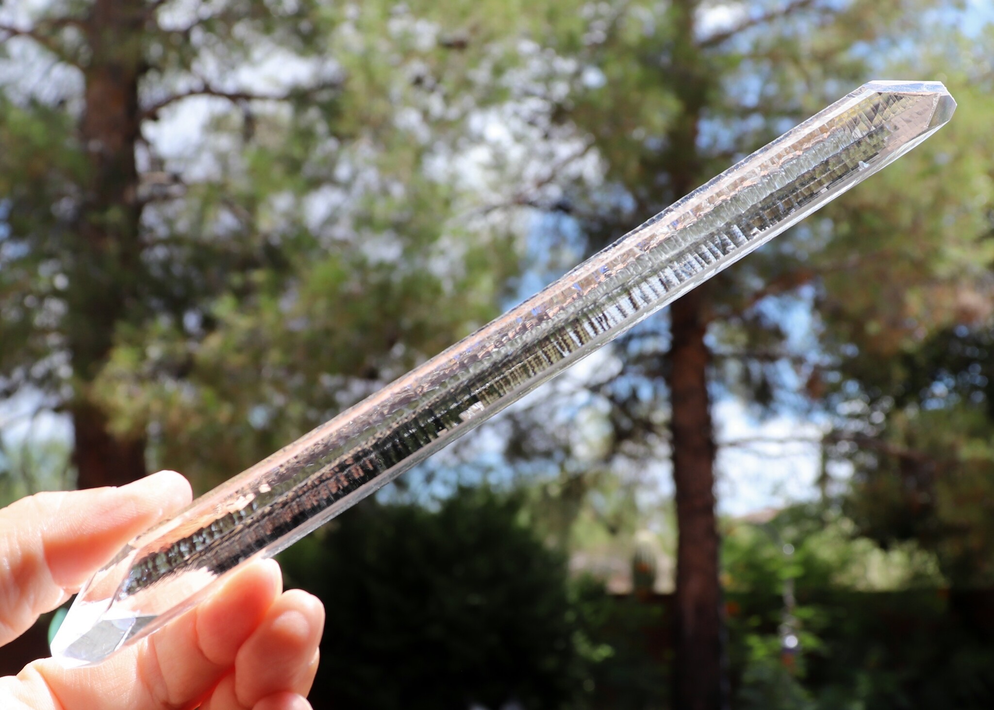 人工的に結晶させた水晶です。形成上の理由だと思いますが、両端に折り取った部分があります。また、ふくらんだ部分や細かい欠損のあることがあります。卸先で見たどの結晶も多かれ少なかれこのようになっており、欠陥ではありません。
