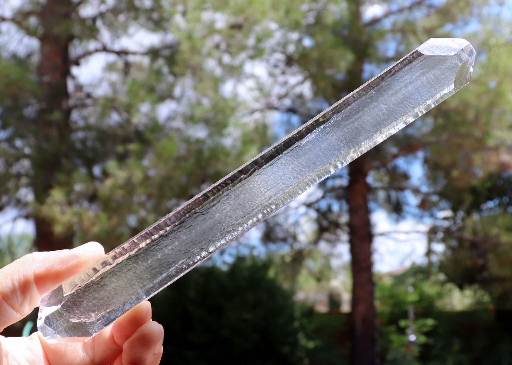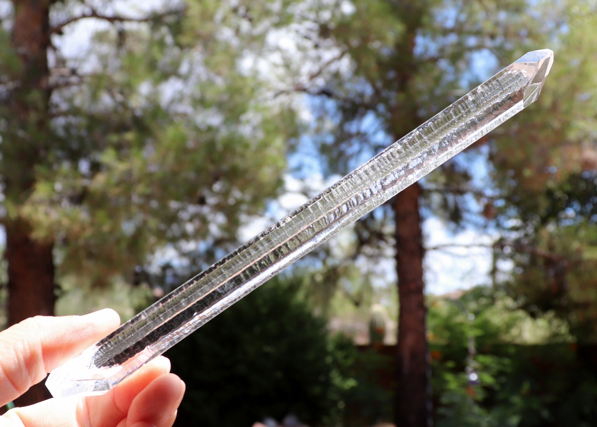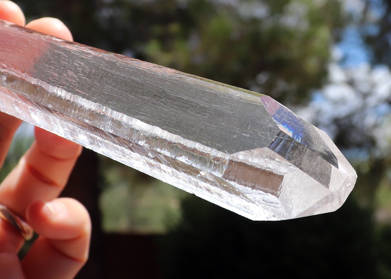 人工的に結晶させた水晶です。形成上の理由だと思いますが、両端に折り取った部分があります。また、ふくらんだ部分や細かい欠損のあることがあります。卸先で見たどの結晶も多かれ少なかれこのようになっており、欠陥ではありません。