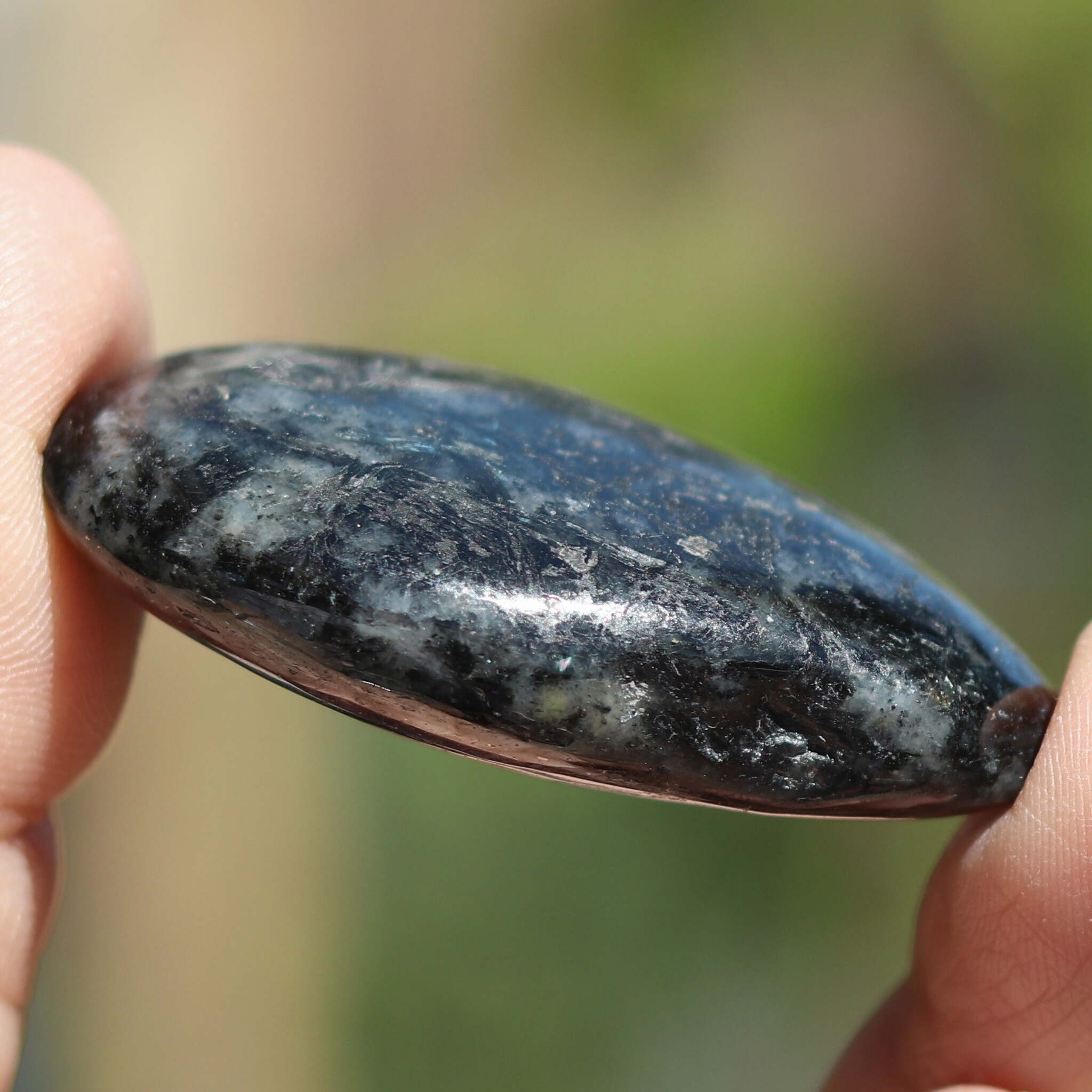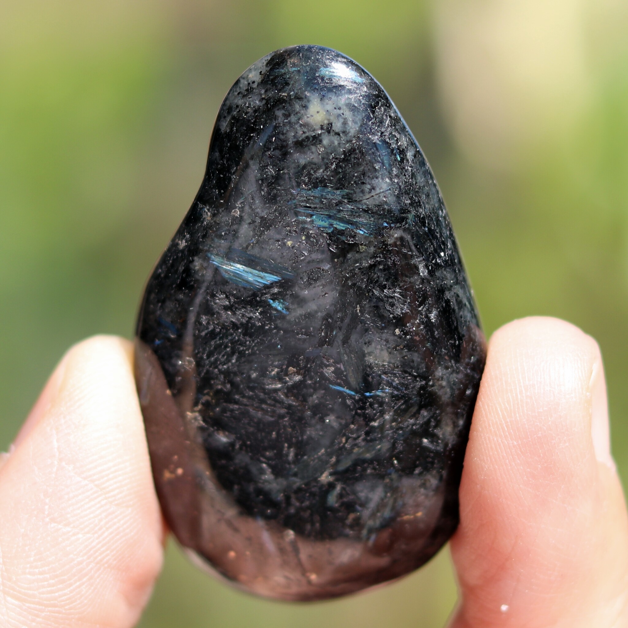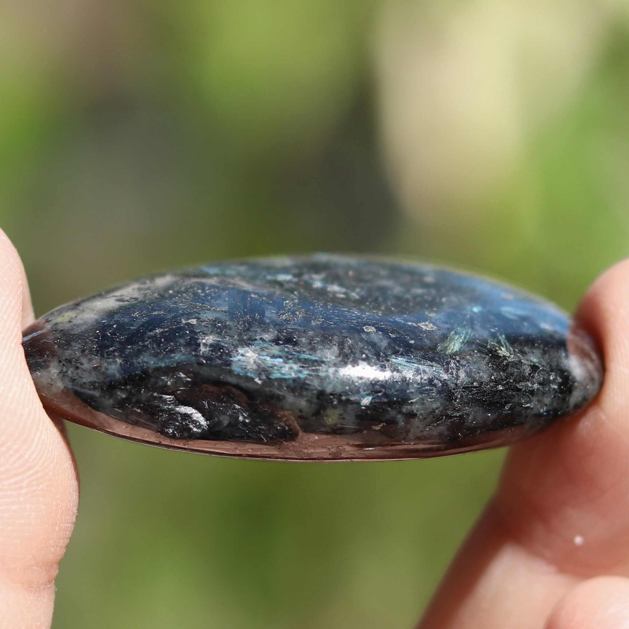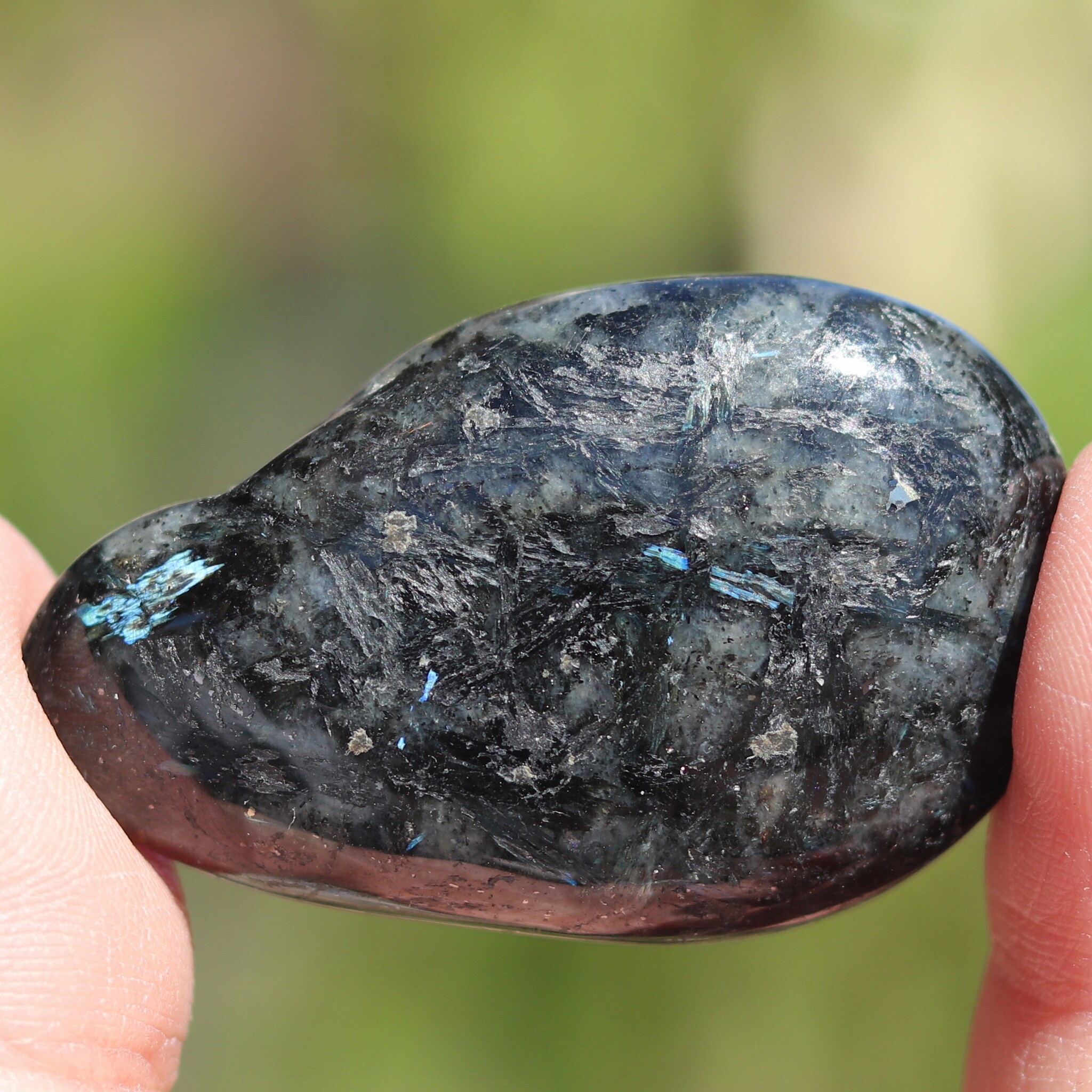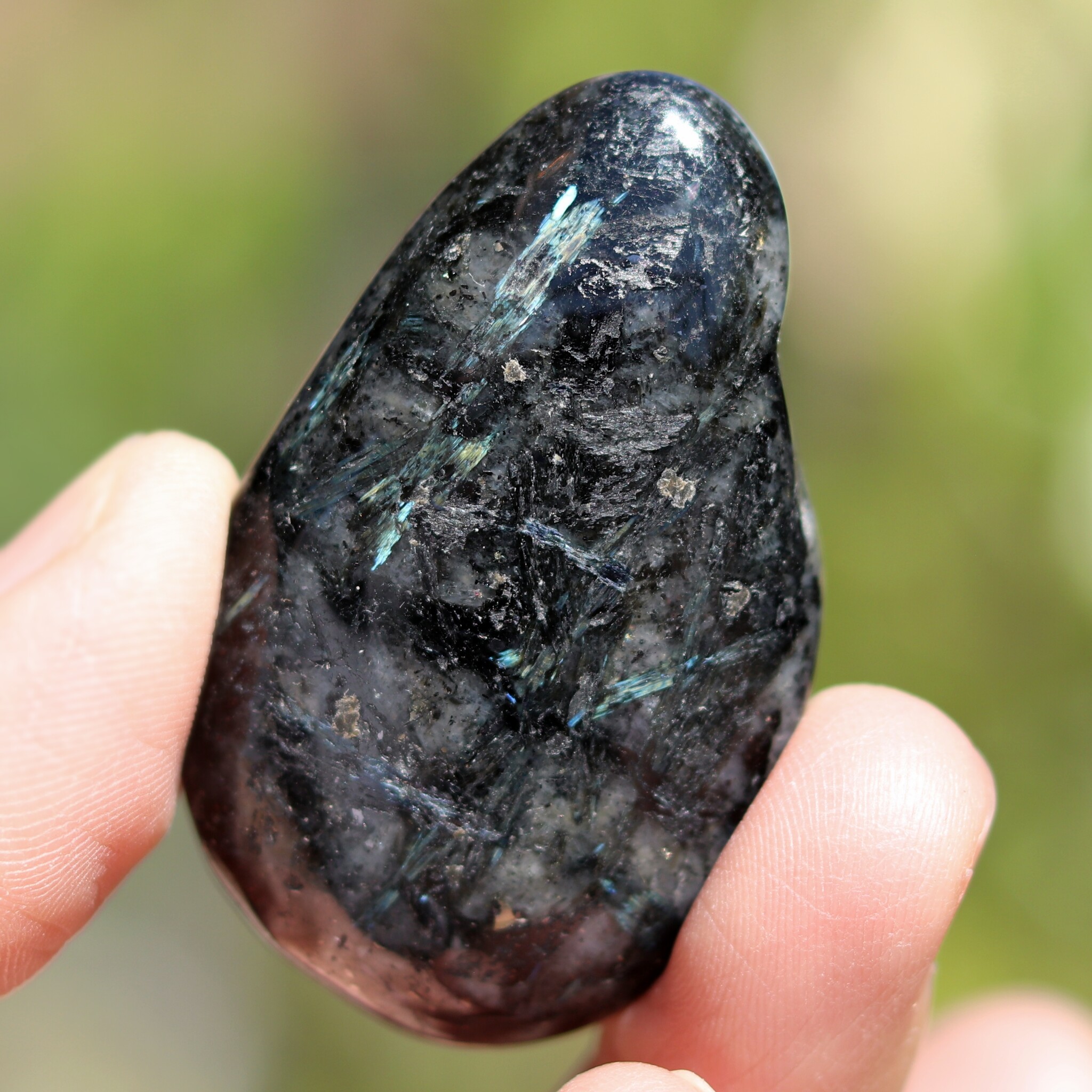 ヌーマイトは希少な変成岩で、30億年前に形成されたと考えられています。角度によって見え隠れする筋状のシラーが、夜空の花火のようできれいです。